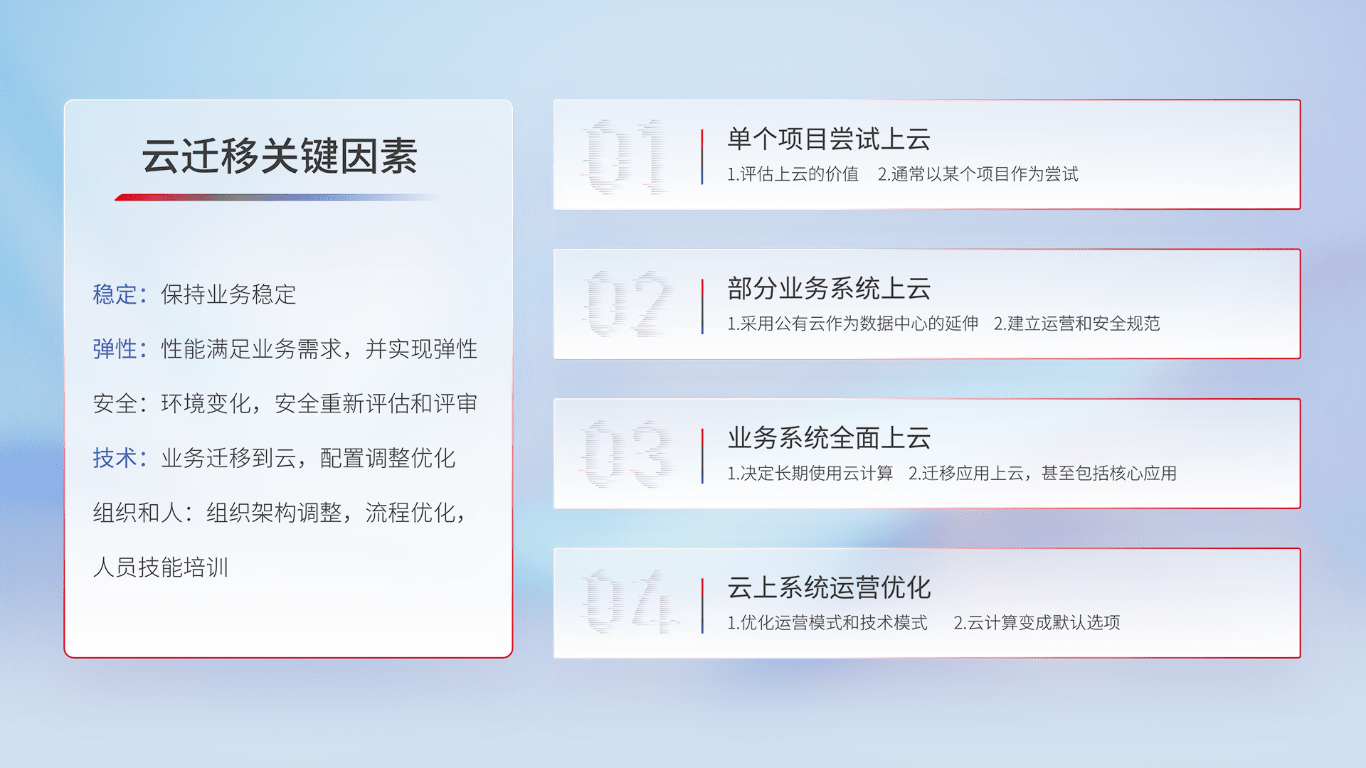 结合实际业务,,从规划设计、、、云平台选型、、云原生改造、、、、数据迁移、、、集成交付,,迁移全过程为客户识别最佳上云路径,,,,做好风险识别管理,,,设计网络架构、、、、身份权限、、、、安全审计合规、、、操作审计、、日志审计、、、监控告警策略、、多站点容灾设计等,,,对云上基础设施进行整体规划,,,,提升IT治理水平,,,,以满足弹性、、、高可用、、、、高性能的需求。。。