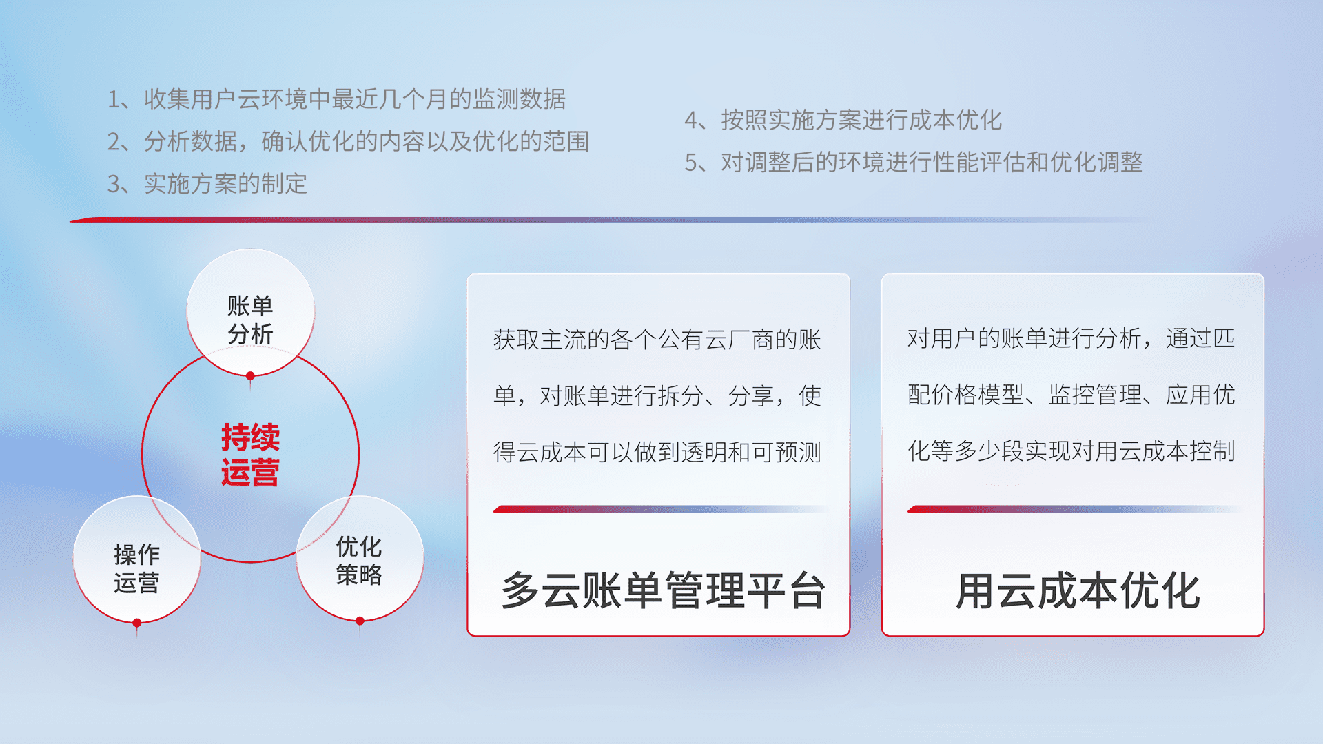 通过多云纳管,,以统一的资源数据模型把客户的云资源进行抽象和封装,,,进而实现对多云资源的统一操作,,保障云资源管理的可靠性、、稳定性与可用性。。。。量身定制化运维内容,,,配置、、、、开发运维、、、补丁管理、、、备份、、、监控、、认证和访问管理、、、、审计和日常巡检等,,,保障在用云过程中的可靠度,,稳定度以及高可用率。。