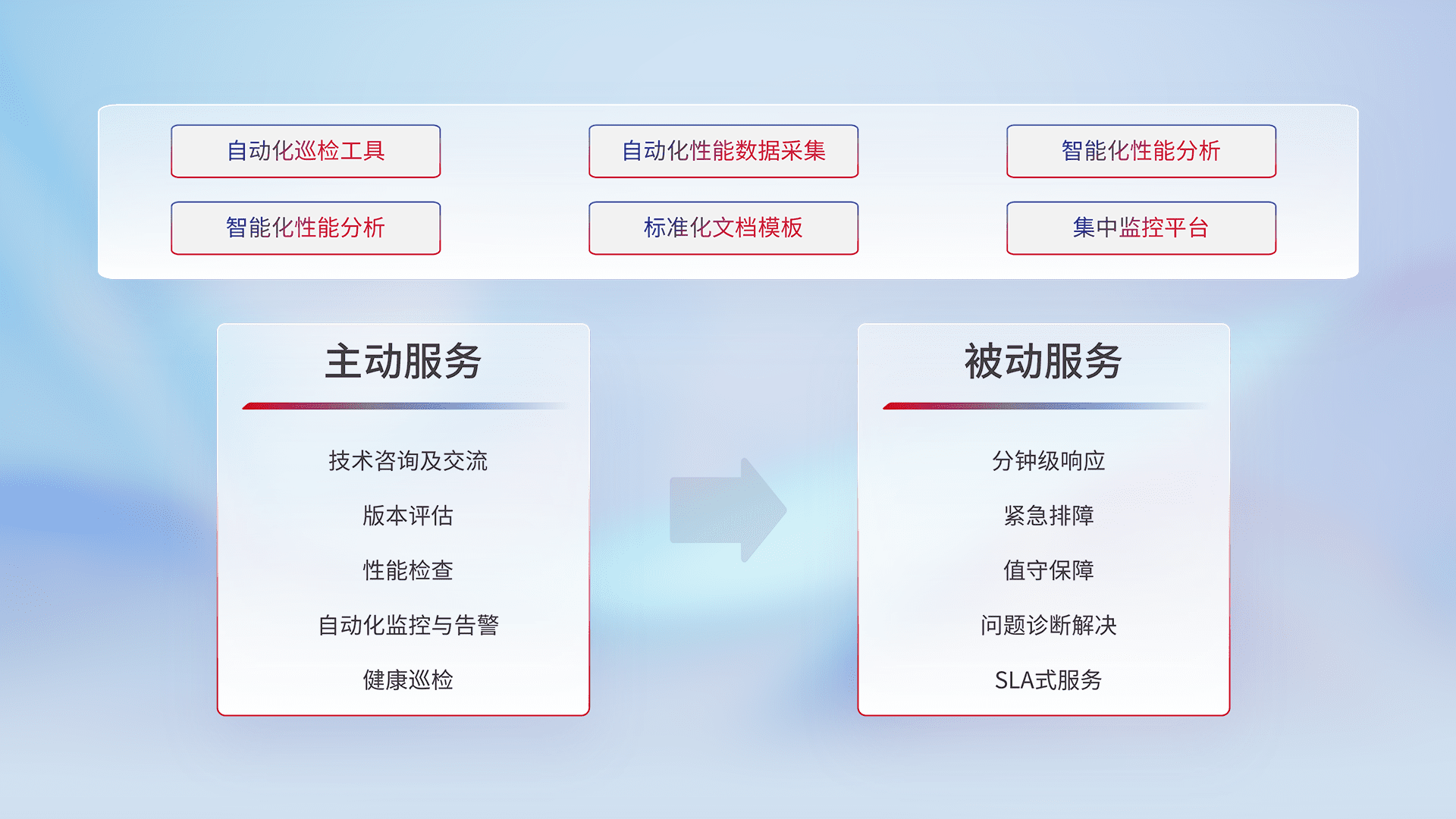 智能化工具和标准化文档,,,保障服务质量,,提供主动服务(包含技术咨询、、版本评估、、性能检查、、、自动化监控与告警、、健康巡检)和被动服务包含(分钟级响应、、紧急排障、、、值守保障、、、问题诊断解决、、SLA服务)。。。。